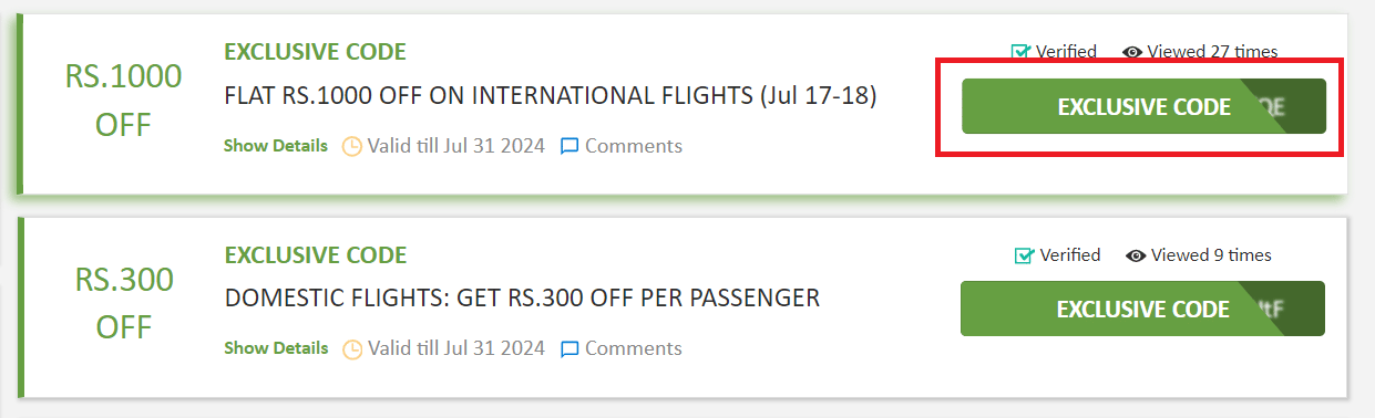 | Flights | Flat Rs.1000 Off per passenger on one-way and International return trips and Flat Rs.300 off per person on domestic flights | CJAIR |