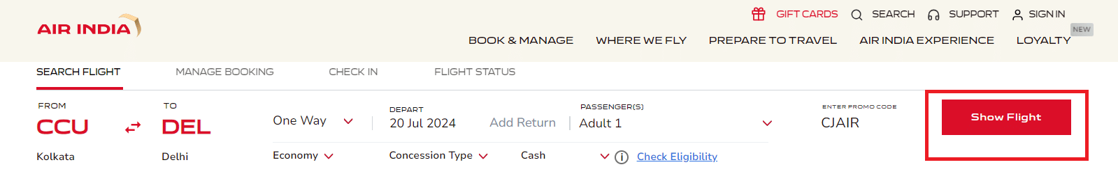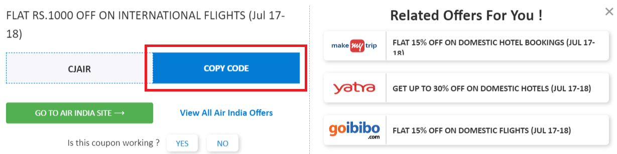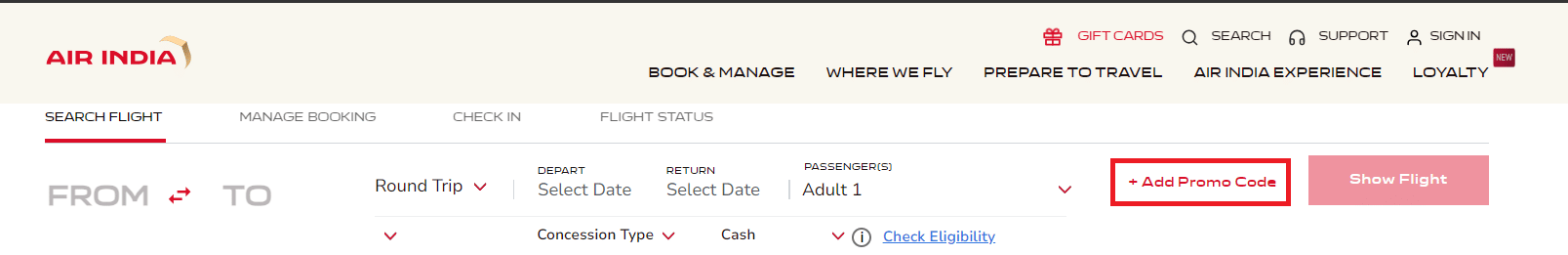 Step 3: Visit Air India and Fill in your travel details and the copied coupon code here.