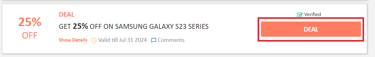 DealDealShow Details- Valid on Samsung Galaxy S23 FE, Galaxy S23 Ultra, Galaxy S23, etc.
