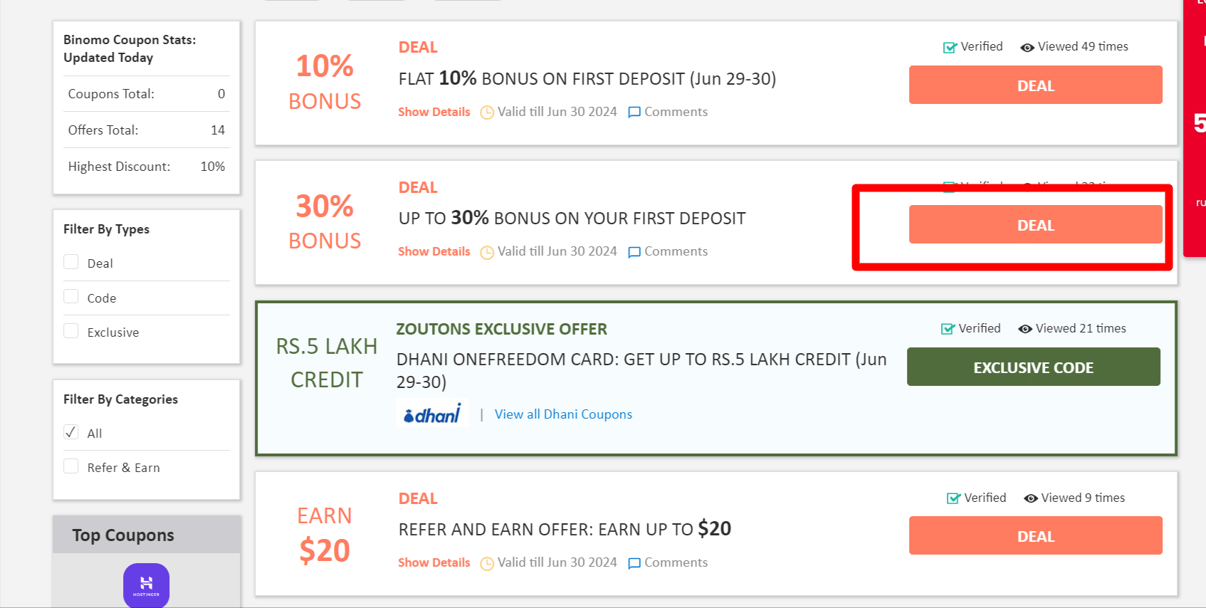 DealDealShow DetailsUse the Binomo coupon to get 10% deposit bonus Applicable on First deposit Benefits: Withdrawals within 30 minutes, 24*7 customer support, etc.