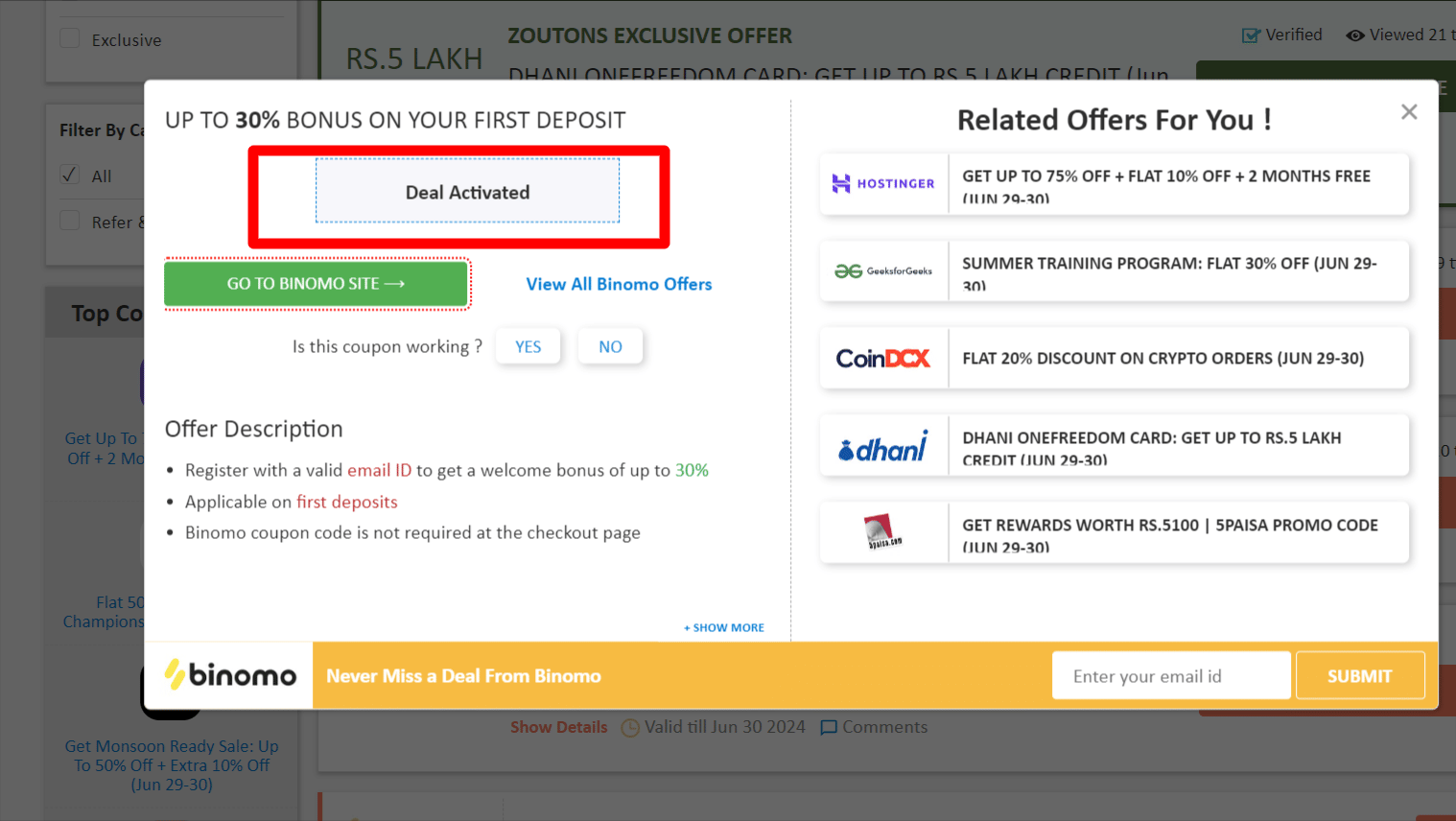 DealDealShow DetailsSign up amount Rs.3324 Starting balance Tether 100 Rebuy cost Rs.3158 - Binomo coupons are available to all users aged above 18 years