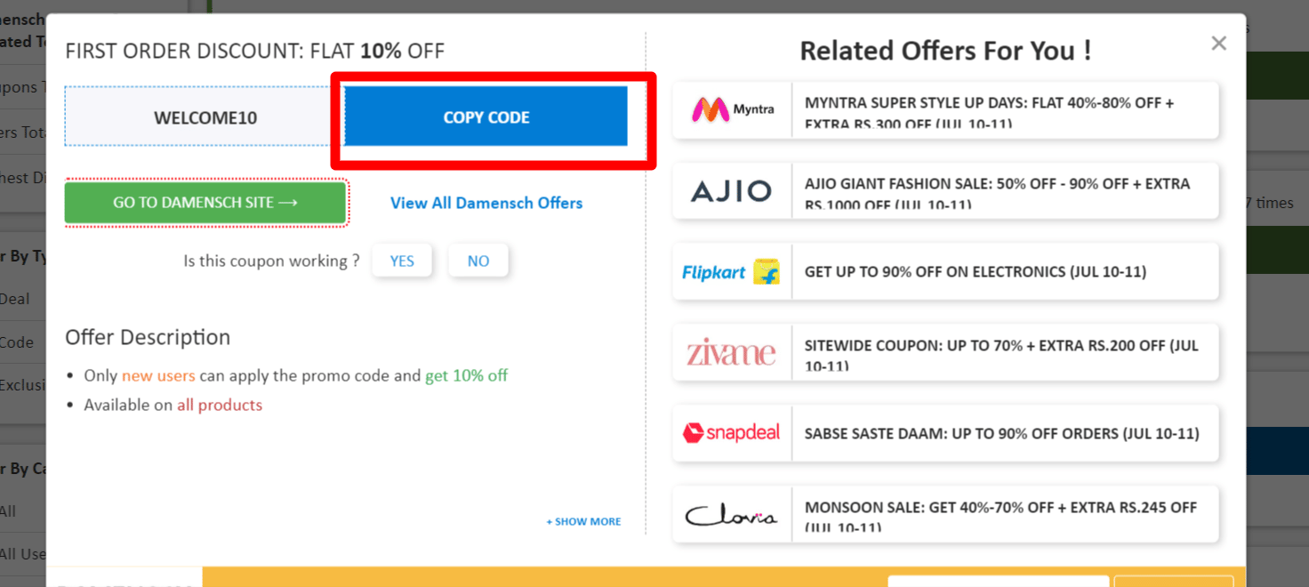 - New User Offer: Place your first online Damensch order and get a flat 10% discount via code- WELCOME10.