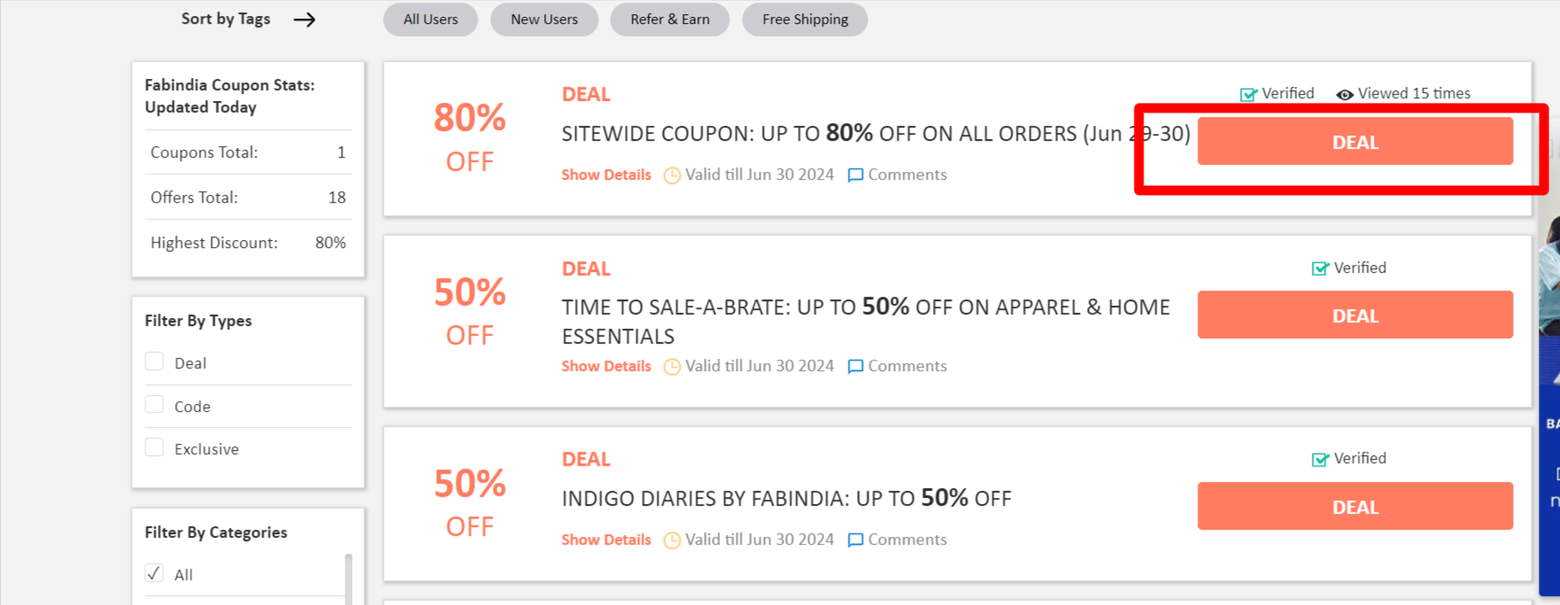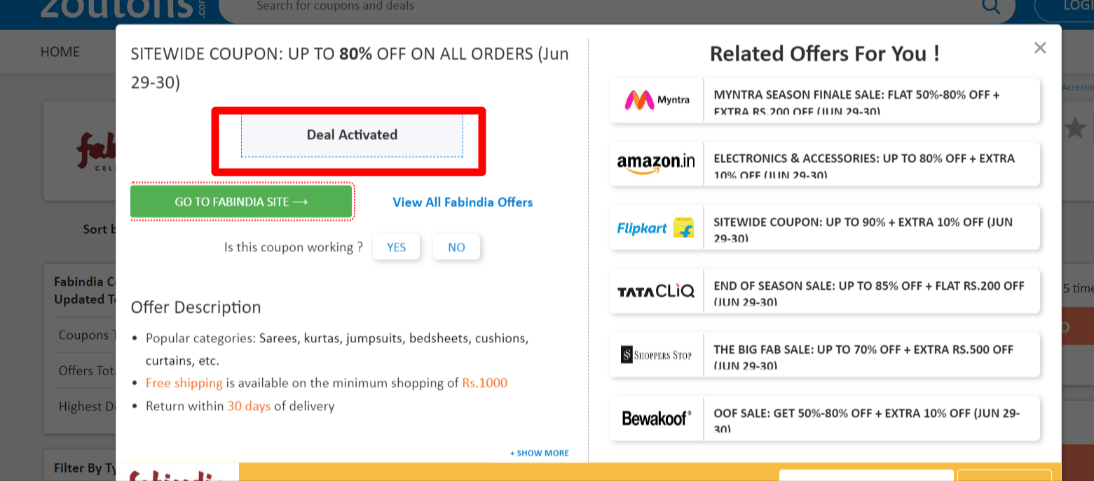 Step 1: Visit Zoutons and check for the Fabindia coupons