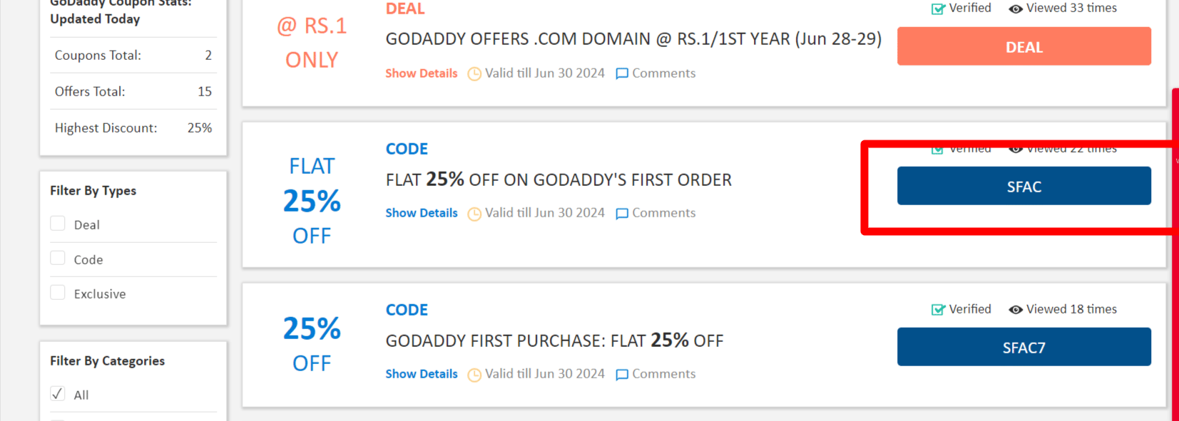 Step 1: Visit Zoutons and Click on the GoDaddy Coupon Code