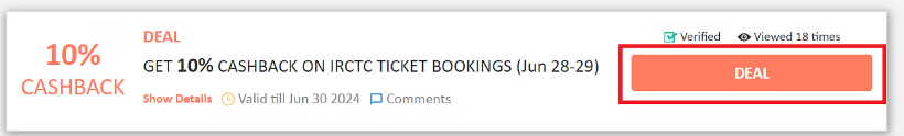 DealDealShow Details- Redeem 10% cashback on train ticket bookings