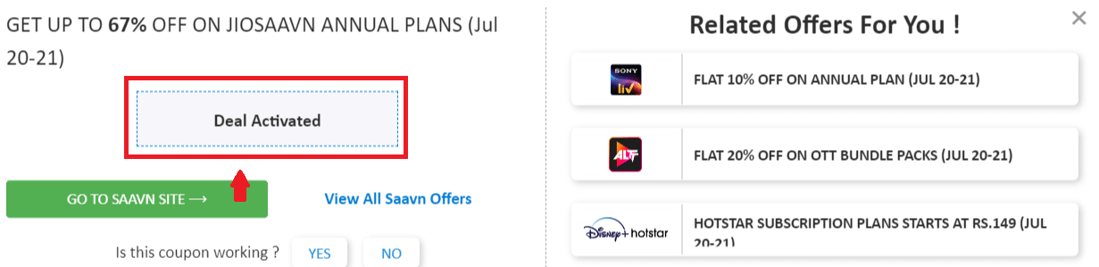 Step 2: Once, you click on the "GET DEAL", the offer gets activated.