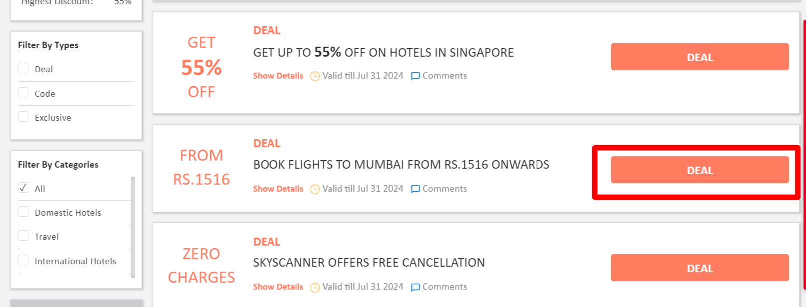 Step 3: This coupon will redirect you to Skycanner's official website, where you can find the discount applicable to your booking while selecting from the available options.