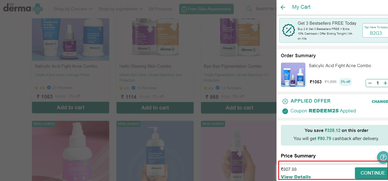 You can earn up to Rs.200 cashback on some of the Derma Co purchases. Look for their cashback deals on the website before placing any order.