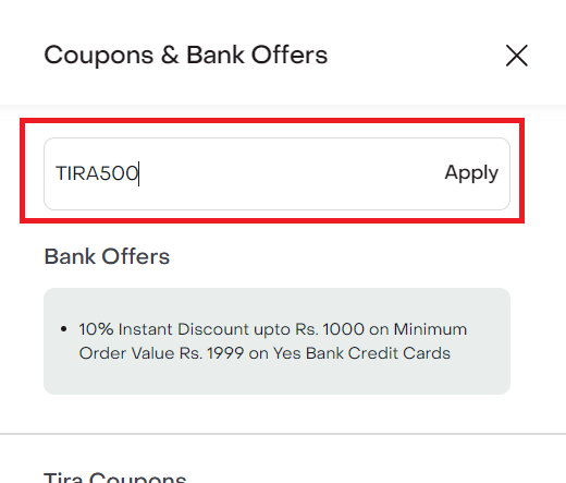 - Sign-up Offer: Get Rs. 500 off on your first purchase on orders above Rs. 1,799. Use the Tira coupon code to avail of this offer.