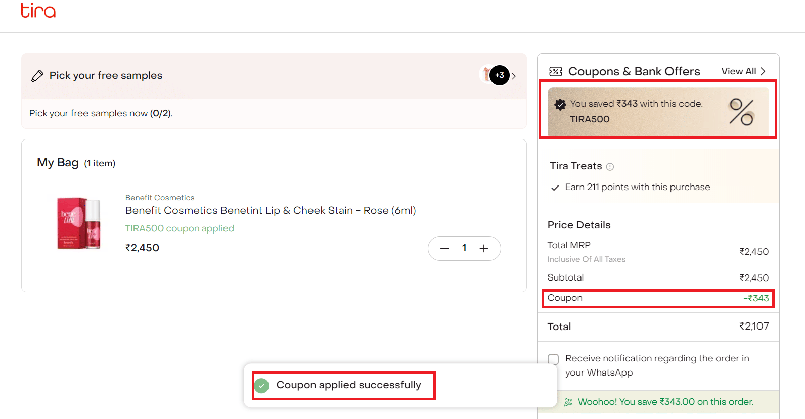 - Tira Treats: Earn 10 points for every Rs.100 spent on the site with exclusive deals and avail of additional discounts on your total cart value.