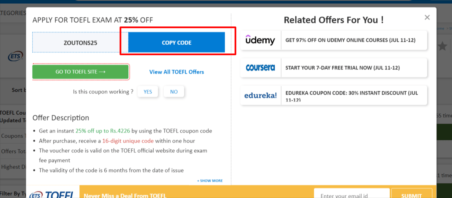 ZOUTONS25Exclusive CodeShow Details- Get an instant 25% off up to Rs.4226 by using the TOEFL coupon code