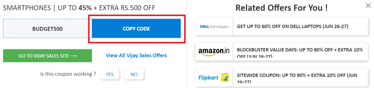 BUDGET500View CodeShow Details- Redeem an extra Rs.500 discount via the Vijay Sales promo code