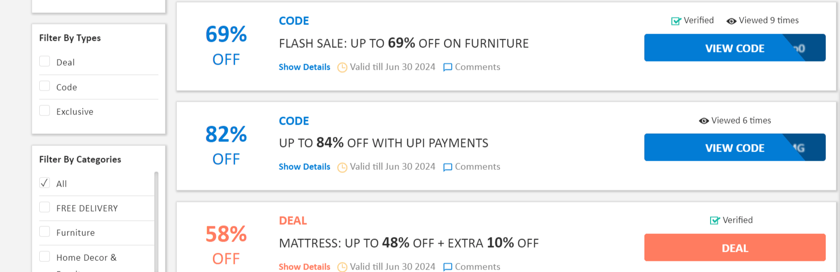 | UPI Discount Offer | Save up to 84% on furniture and mattress |