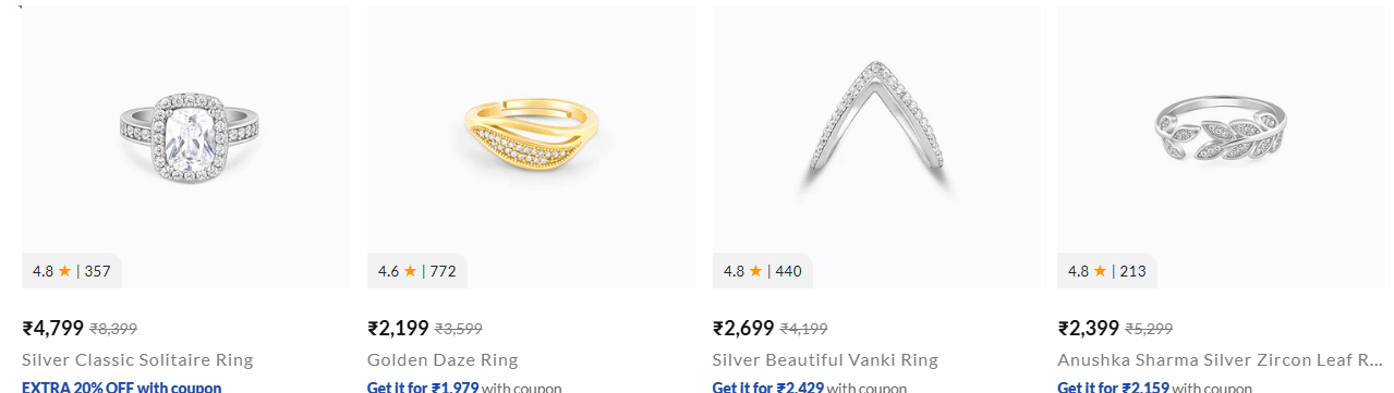ZOUTON500Exclusive CodeShow DetailsOffer Details Description Discount Flat ₹500 off on Silver, Gold & rose gold jewelry Minimum Order Value Applicable on orders worth ₹1999 or above Eligible Categories Silver, Gold, and rose gold jewelry Payment Methods Credit/Debit Cards (Visa, Amex, Mastercard), Net Banking, UPI, Cash on Delivery, Pay Later ABOUT THIS OFFER