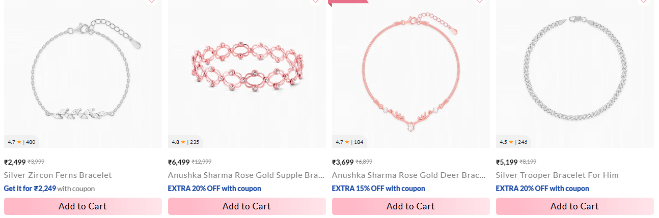 ZOUTON10Exclusive CodeShow DetailsApplicable On Additional 10% off on Mangalsutras, Sliders, Classic, Statment, and 200+ more bracelet designs Minimum Spend Rs.799 Valid PAN India Other Terms Cannot be clubbed with any other offer or discount code