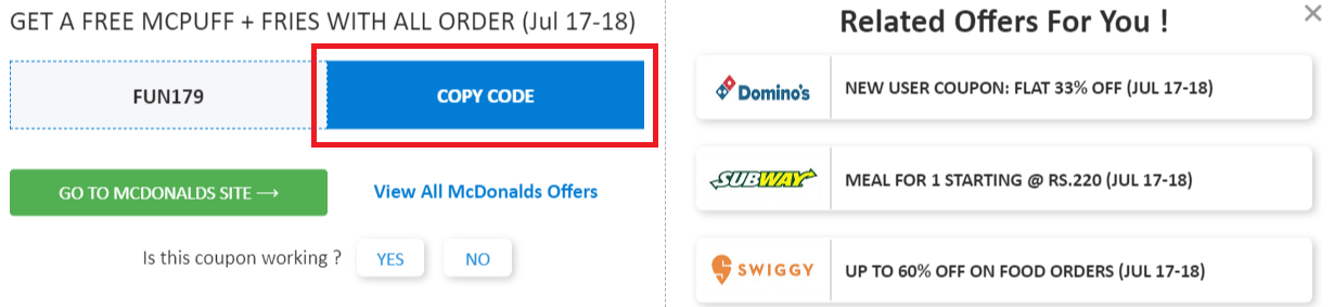 - McDonald's promo code is valid in West and South McDonald's India