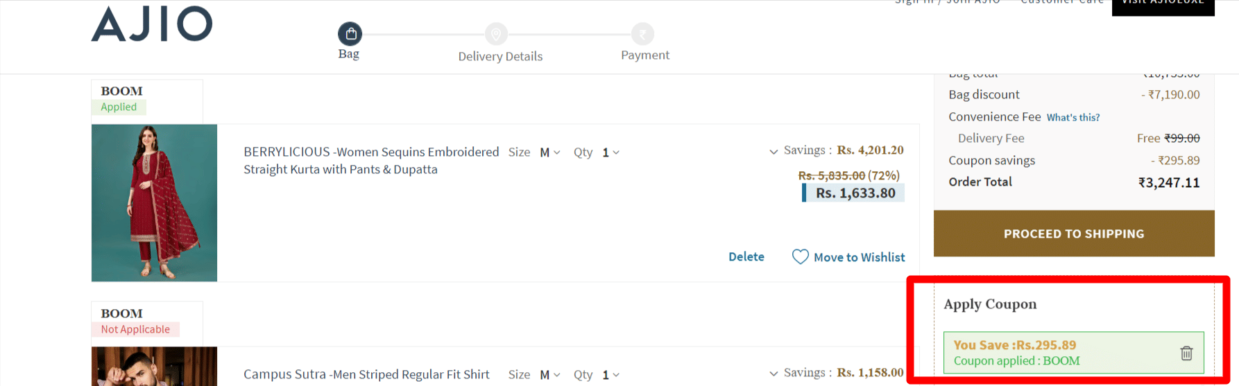 This is Ajio’s premium segment. It includes designer and higher-end labels. Not all coupon codes apply here, so it’s important to check the offer details if you’re shopping in this category.