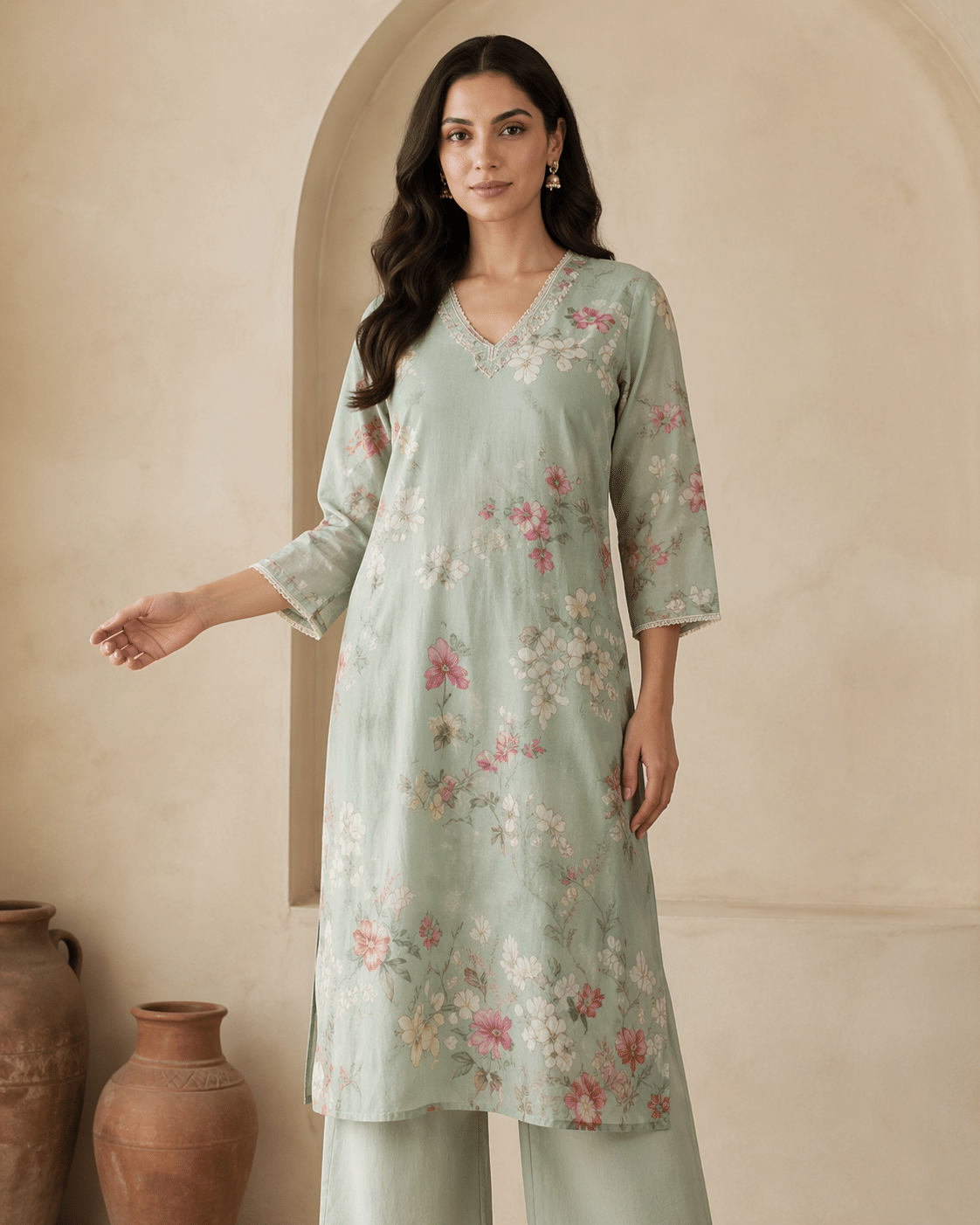 Biba's block-printed kurta-palazzo set is ideal for summer — lightweight cotton, breathable construction, and a versatile aesthetic that works for both casual days and festive gatherings. One of the highest-rated ethnic sets on Ajio.