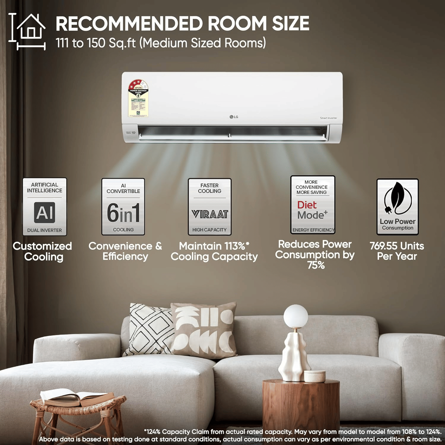 For a room of 100-150 sq ft, a 1-tonne AC is suitable. For 150-250 sq ft, a 1.5-tonne AC is recommended. For larger spaces, a 2-tonne or higher capacity is needed.