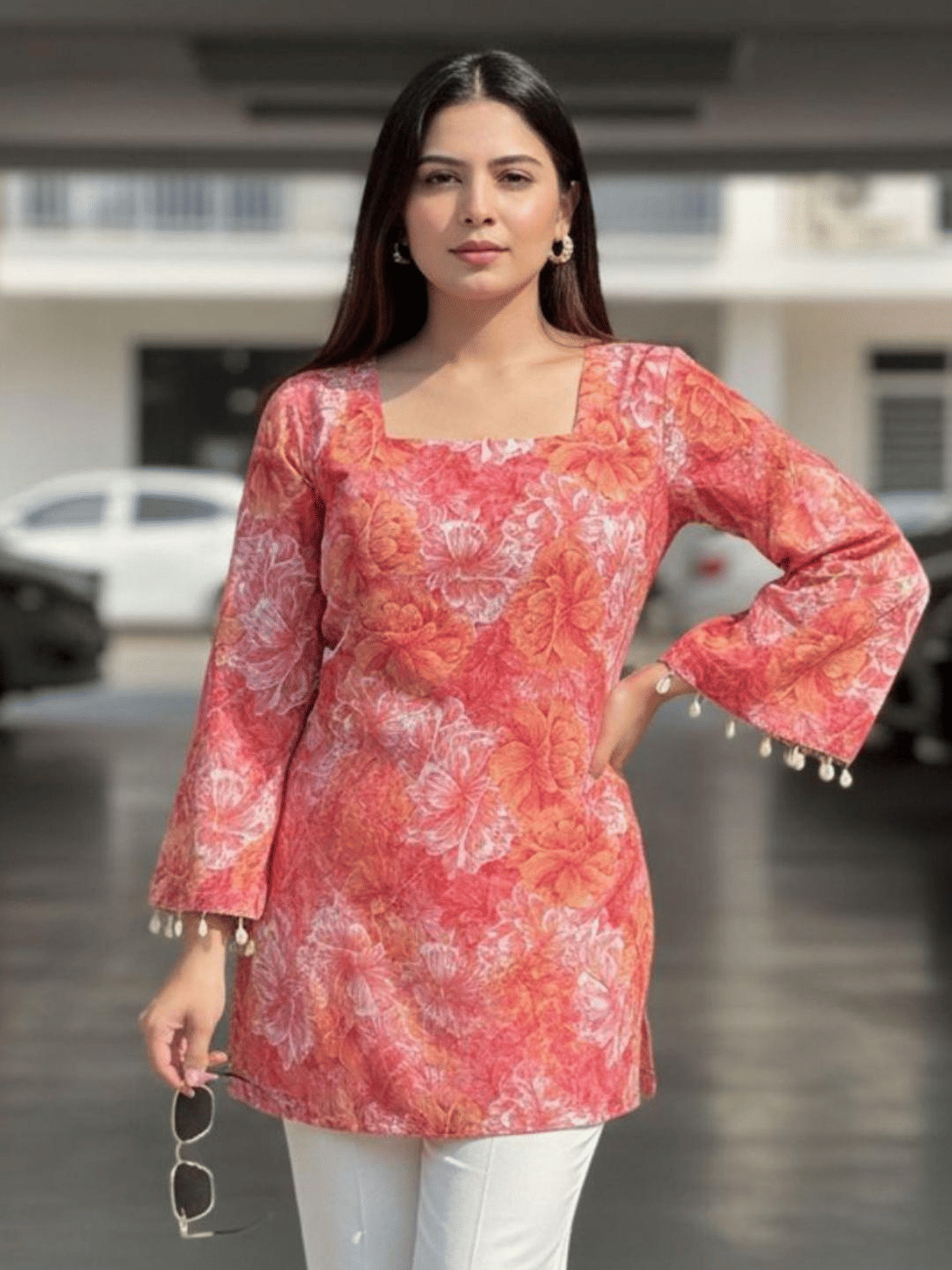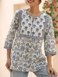 A breezy floral-print pure-cotton kurti that keeps you cool and stylish through long office hours with a vibrant pop of color.