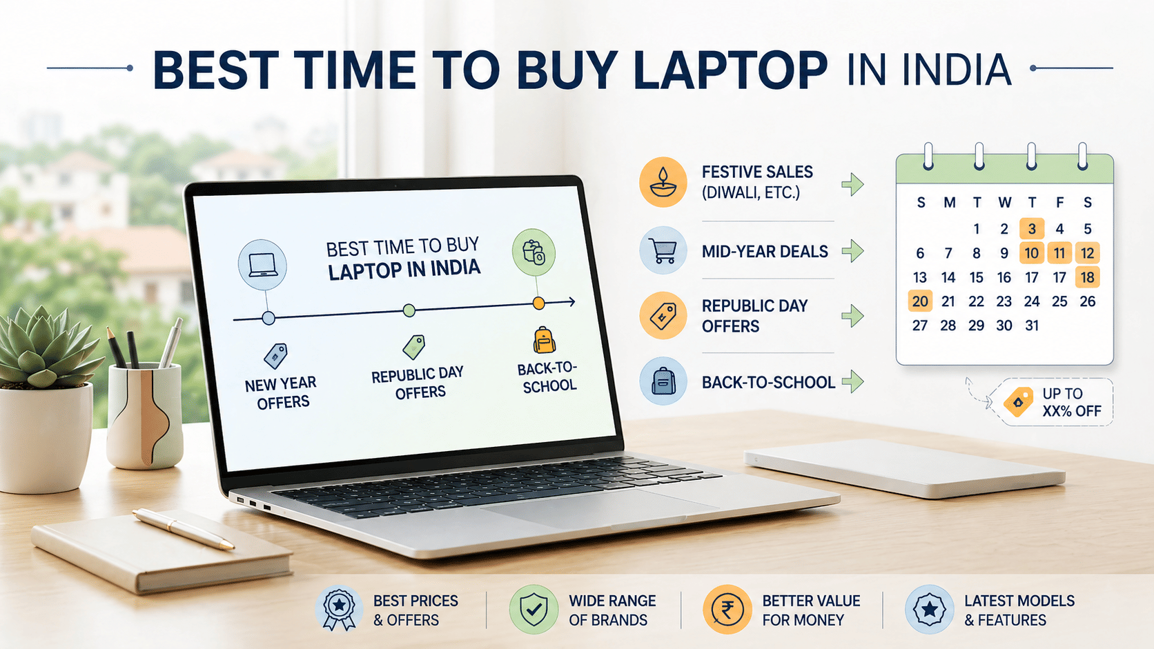 This guide covers the full 12-month window from May 2026 to April 2027 — a practical buying calendar for anyone planning a laptop purchase right now or over the next year. Three peak windows stand out in this stretch: mid-July 2026 (Amazon Prime Day — best for premium), the August–October 2026 Independence Day and festive season (best for mid-range), and January 2027 Republic Day (best reset for anyone who missed the festive window). We also map out which months to skip entirely — and why early September remains the most dangerous time to buy.