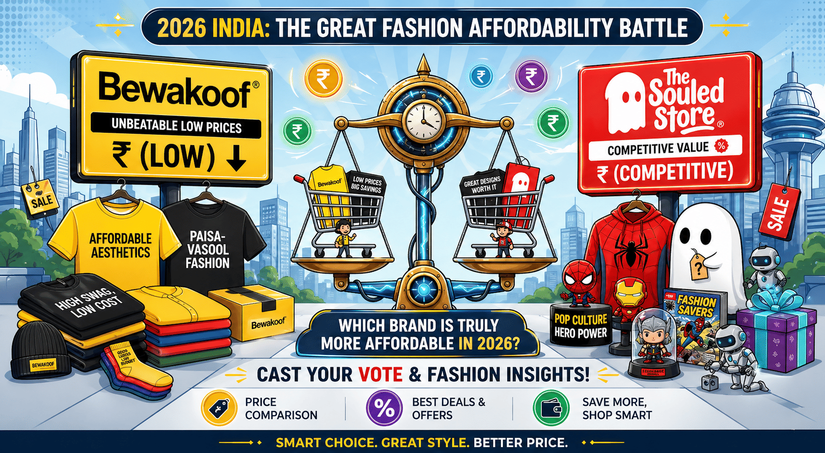 Two brands. One wardrobe. A hundred debates in every college canteen and Reddit thread since 2015. Bewakoof and The Souled Store are India's most recognisable homegrown graphic apparel brands — and they've been fighting for the same wallet ever since. If you've been staring at your cart trying to decide which one to checkout, we did the price work for you.