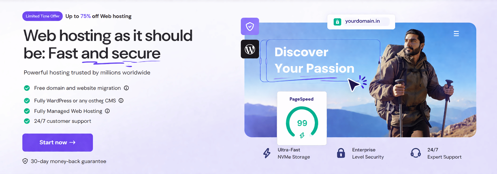 The Hostinger Single plan is the most affordable entry point for anyone starting their first website in India. It includes 10 GB SSD storage, free SSL, weekly backups, and free site migration — all at an unbeatable price of just Rs.69/month on the 48-month plan. Rated 4.8/5 on Google with over 1,237 reviews, Hostinger is trusted by over 5 million website owners worldwide.