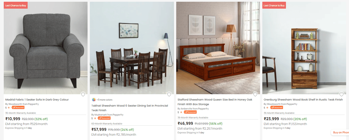 Pepperfry: Pepperfry is known for its frequent discounts and deal-heavy approach. From flash sales and festive offers to coupon codes and bank deals, there are plenty of ways to save. It’s a great option if you’re looking for maximum savings and regular deals.