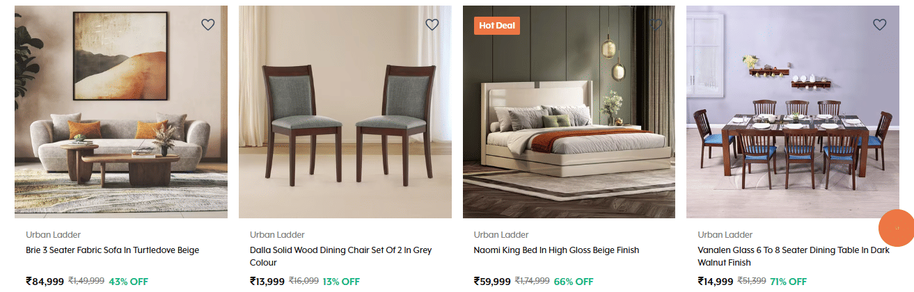 Urban Ladder: Urban Ladder focuses more on value-driven pricing rather than heavy discounts. You’ll find seasonal sales and occasional offers, but the deals are usually limited. It’s better suited for shoppers who prioritize quality and design over big price cuts.