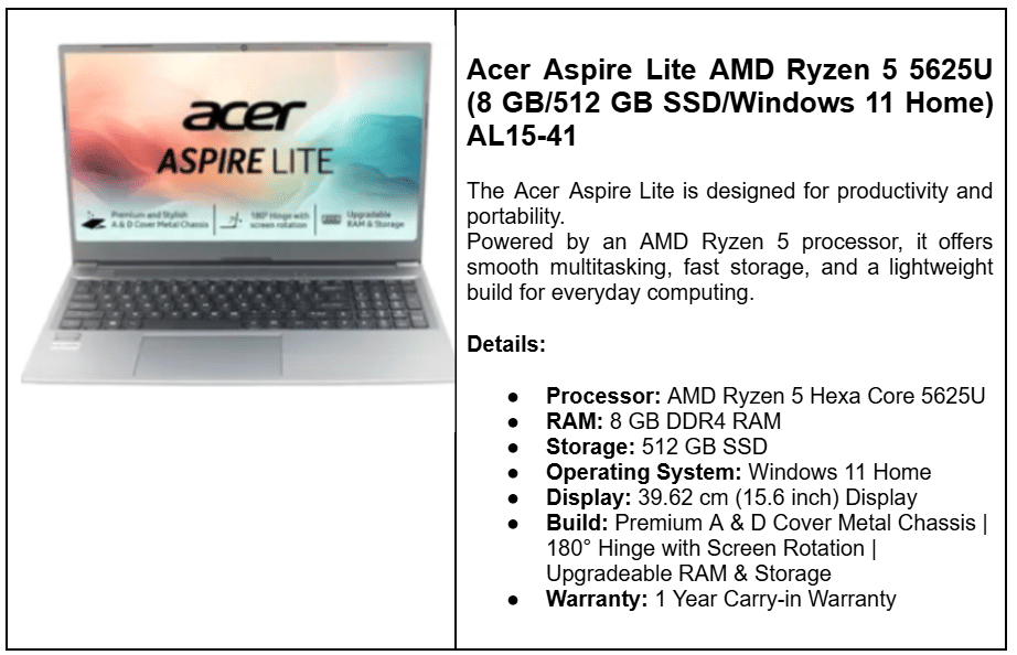 | Acer Aspire Lite (Ryzen 3 5300U) | 8 GB + 512 GB SSD | ₹25,990 | Ryzen 3, 15.6″, Win 11 |