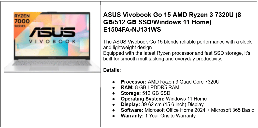 | ASUS Vivobook Go 15 (Ryzen 3 7320U) | 8 GB + 512 GB SSD | ₹28,990 | Ryzen 3, 15.6″, MS Office 2024 |