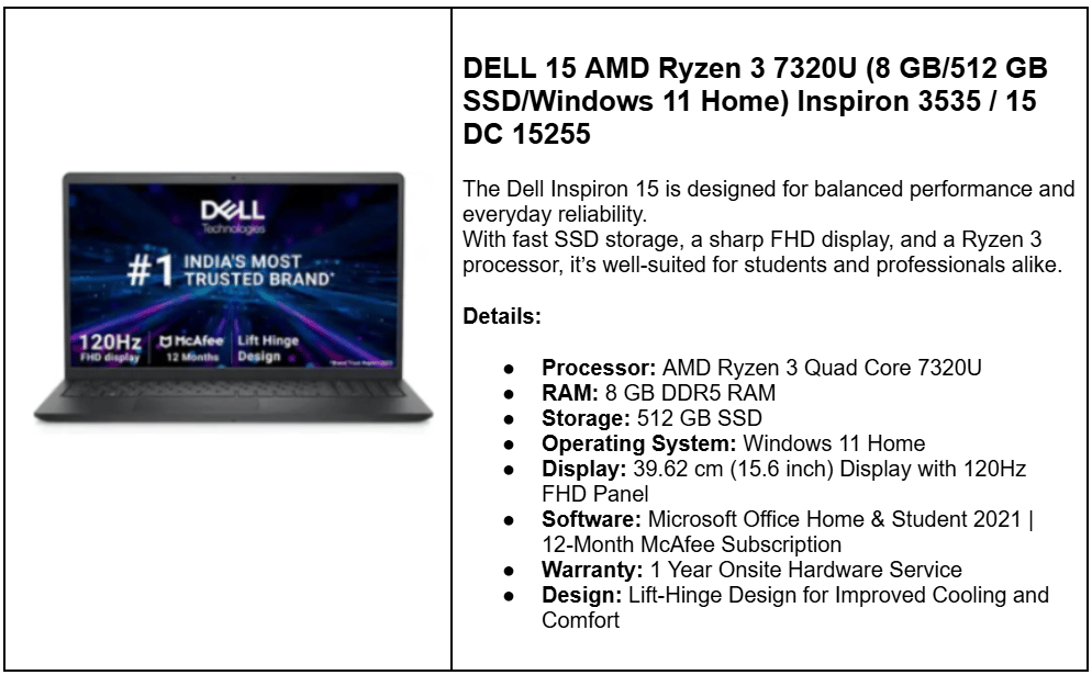 | Dell Inspiron 15 (Ryzen 3 7320U) | 8 GB + 512 GB SSD | ₹28,990 | Ryzen 3, 15.6″, Win 11 |