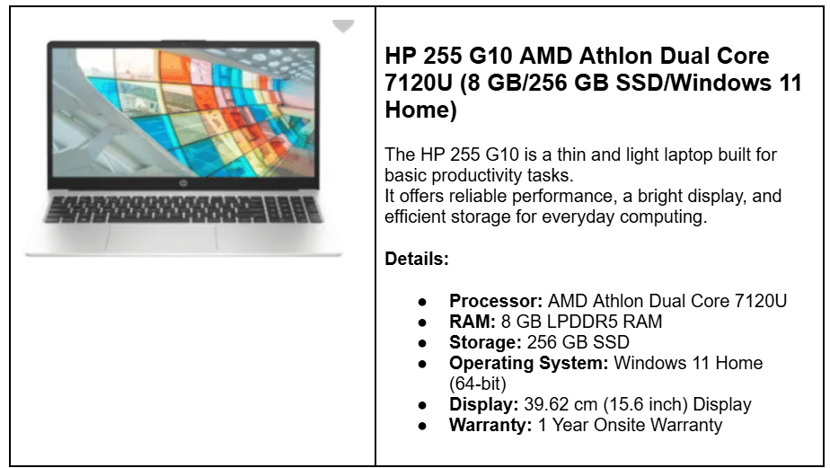 | HP 15 G10 (2025) | 8 GB + 256 GB SSD | ₹25,900 | Athlon 7120U, 15.6″, MS Office 2021 |