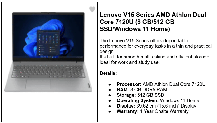 | Lenovo V15 (Ryzen 3 7320U) | 8 GB + 512 GB SSD | ₹28,199 | Ryzen 3, 15.6″, Win 11 |