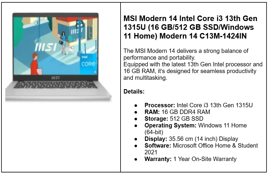 | MSI Modern 14 Intel Core i3 13th Gen 1315U | 16 GB + 512 GB SSD | ₹29,990 | i3 13th Gen 1315U, 14″, Win 11 |