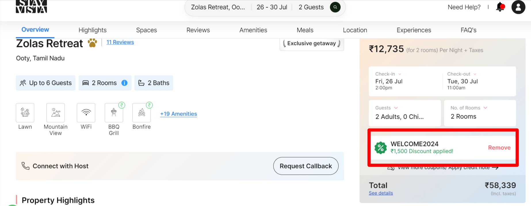 WELCOME2024View CodeMinimum booking amount Not required Maximum discount Rs.1500 Applicable for All users - Minimum booking amount is not required to get up to Rs.1500 off on your next getaway