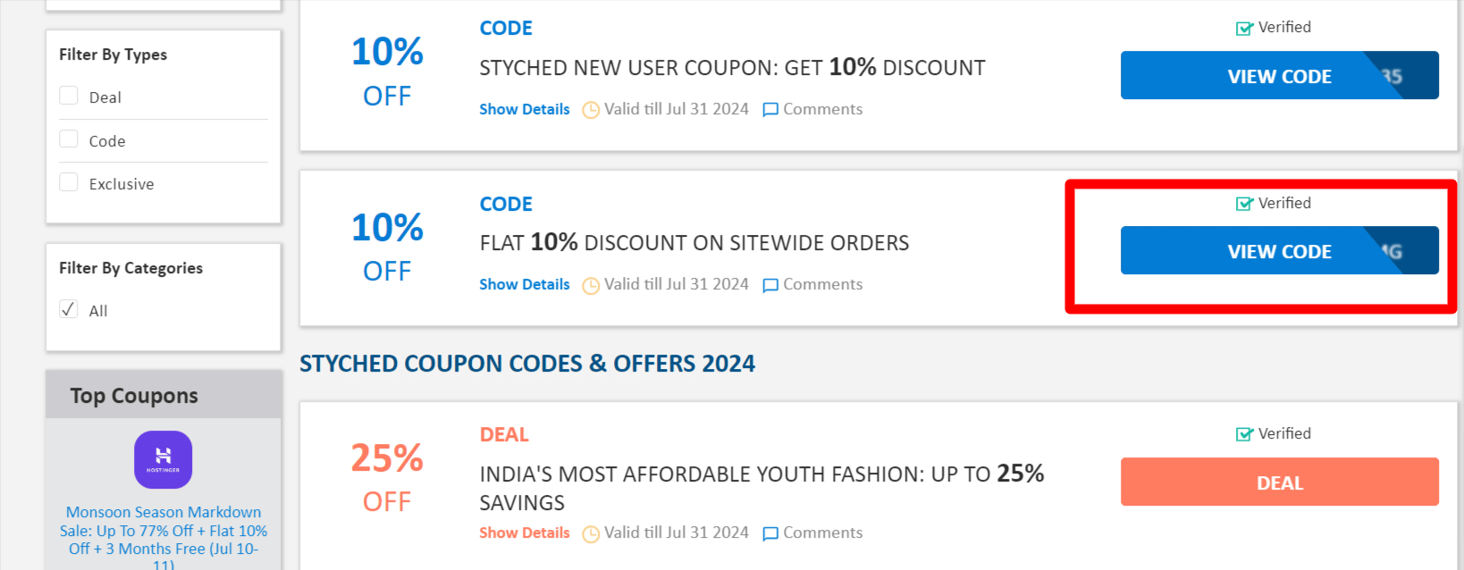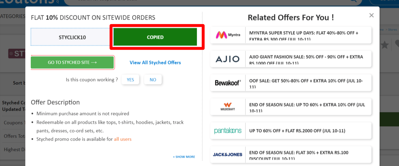 Shop at Styched and add your favorite products to your cart, while making payment add the available coupon code and avail discount on the total amount. Additionally, save on your first purchase.