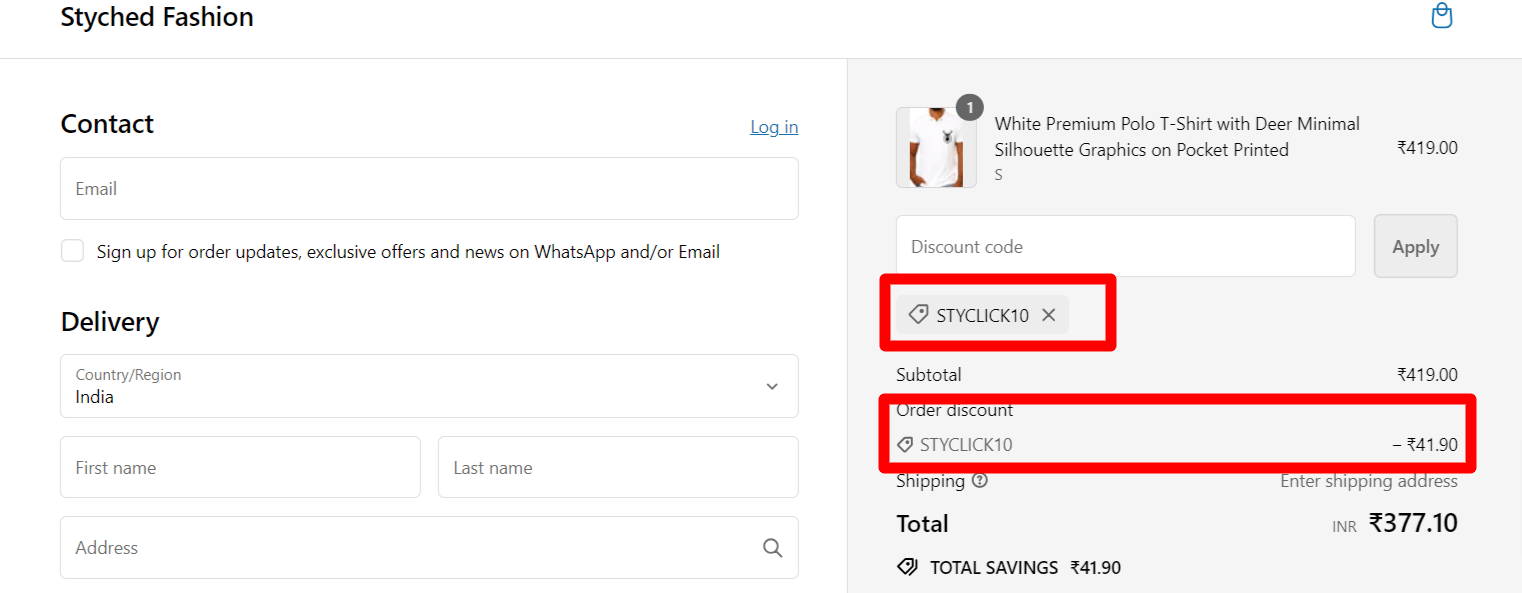 - Styched coupon code is not required to get free shipping on prepaid orders