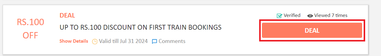 DealDealShow Details- Get a flat Rs.100 off on the first train booking